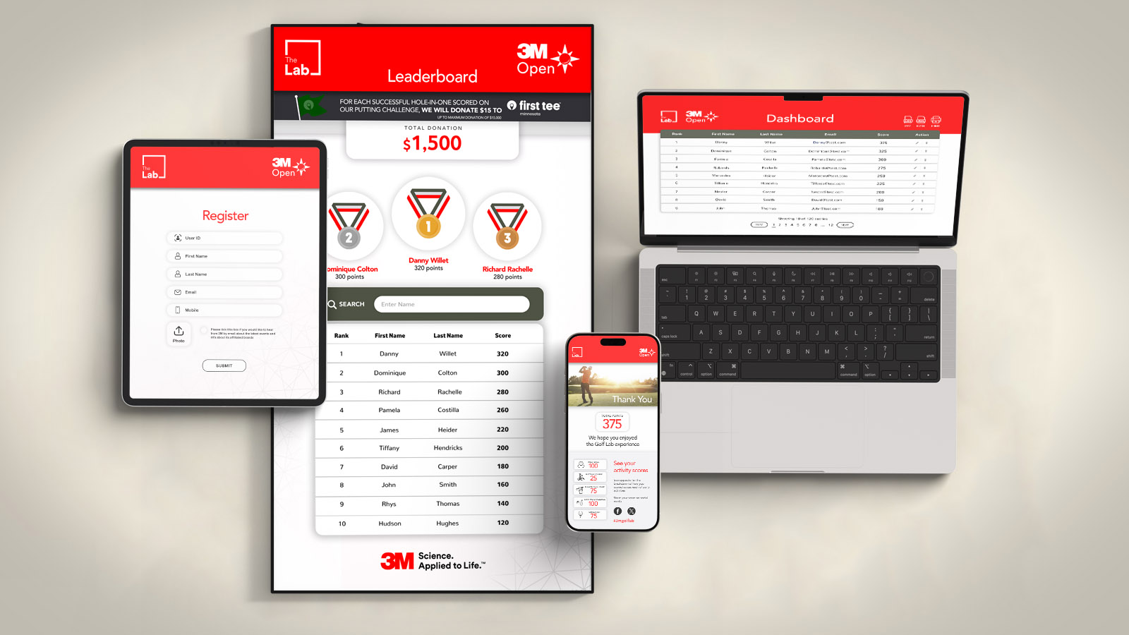 We developed an end-to-end digital user journey for the activation space on-site. Users were asked to register, complete a product themed quiz, record a score at each of the club-in-hand golf activities then receive a summary email detailing their score and linking to a survey where users could review their experience. Also, 3M donated $15 for every hole-in-one reordered at the main activation area and also at a satellite experience at their hospitality suite. We added a running donation amount to the live leaderboard showing overall scores and total donation.